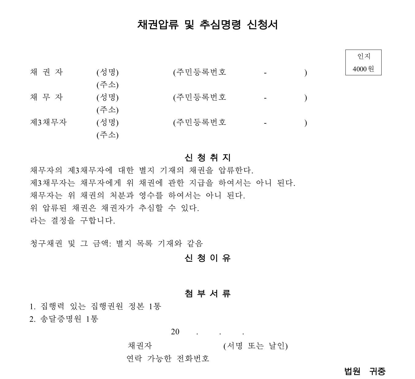- 인지대 : 압류 및 추심명령 신청을 위한 인지대는 4,000원이 소요된다.